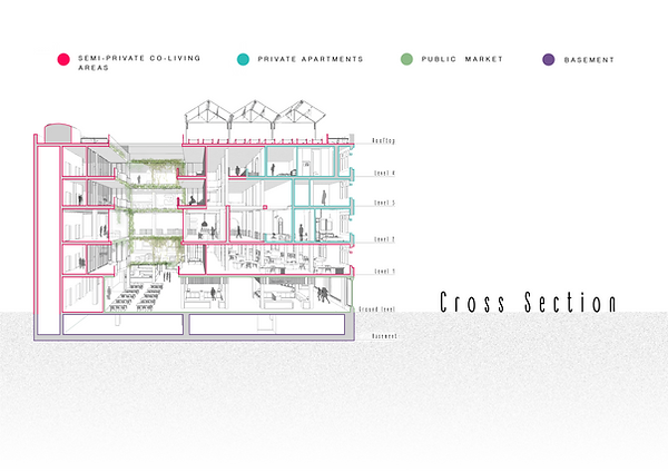 Vertical Village is a multi-storey mixed-use adaptive reuse proposal for the iconic James Smith Building on Wellington’s lower Cuba Street. The proposed new spatial programme incorporates co-living, co-working, and community spaces, as well as a rooftop garden, green atrium, and ground floor public market. The project is guided by the Living Building Challenge regenerative design framework, with each space designed to promote meaningful connections between residents, the community, and nature's living systems.